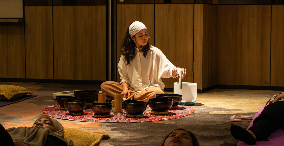 Kegiatan selanjutnya bersambung dengan 'Sound Bath' bersama Mia Gofar. Sesi yang berlangsung sekitar satu jam ini mampu memberikan ketenangan dan penyembuhan melalui getaran suara imersif. Usai mengikuti sesi ini, para tamu atau peserta pun bisa saling bertukar cerita mengenai pengalaman yang dirasakan selama mengikuti sesi ini. Di kesempatan ini pula, seluruh yang hadir berkesempatan untuk menikmati minuman jamu Kunyit Asem yang menyegarkan dan Overnight Muesli nan menyehatkan.