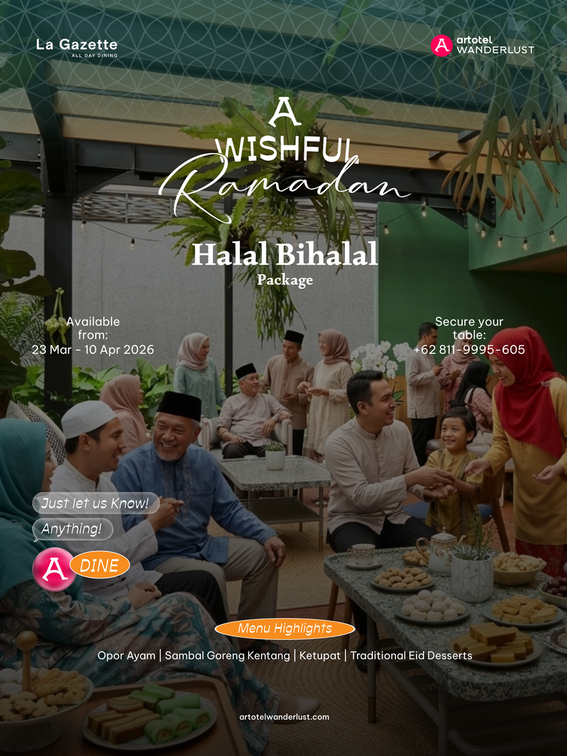 Artotel Casa Kuningan mempersembahkan Paket Halal Bihalal 'A Wishful Ramadan' dengan pilihan menu mulai dari Opor Ayam, Sambal Goreng Kentang, Ketupat, hingga berbagai hidangan khasnya perayaan Idulfitri. Penawaran istimewa ini diwujudkan untuk mempererat tali silaturahmi antar sesama.